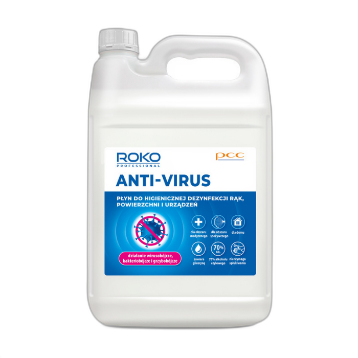 ROKO® PROFESSIONAL ANTI-VIRUS to wydajny i skutecznie działający płyn do higienicznej dezynfekcji rąk, powierzchni i urządzeń. Produkt rekomenduje się do dezynfekcji różnego rodzaju powierzchni twardych oraz urządzeń. Dzięki zawartości substancji czynnej w postaci alkoholu etylowego występującego w stężeniu 70%, produkt wykazuje bardzo wysoką skuteczność działania. Posiada doskonałe właściwości wirusobójcze, bakteriobójcze i grzybobójcze. Polecany jest szczególnie do stosowania w obszarze medycznym oraz w innych obszarach wymagających przestrzegania bardzo wysokiego poziomu higieny.